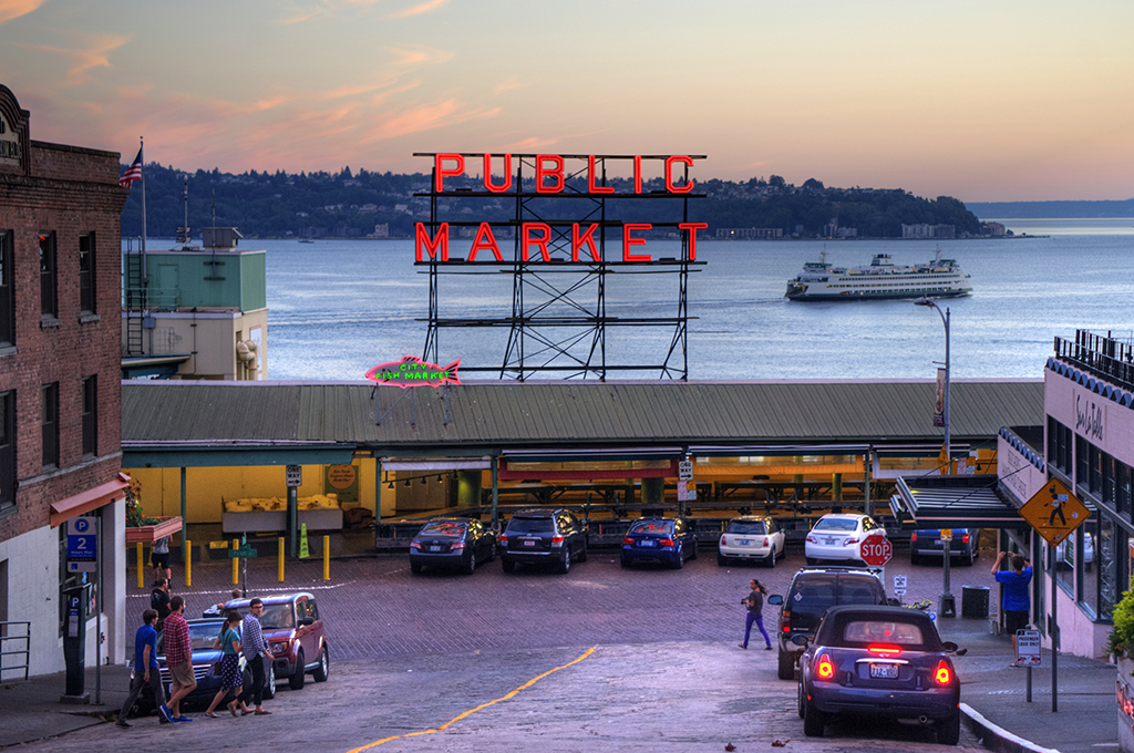 The “Public Market” sign at the foot of Pine Street was installed in the late 1920’s, predating its more famous counterpart farther south.