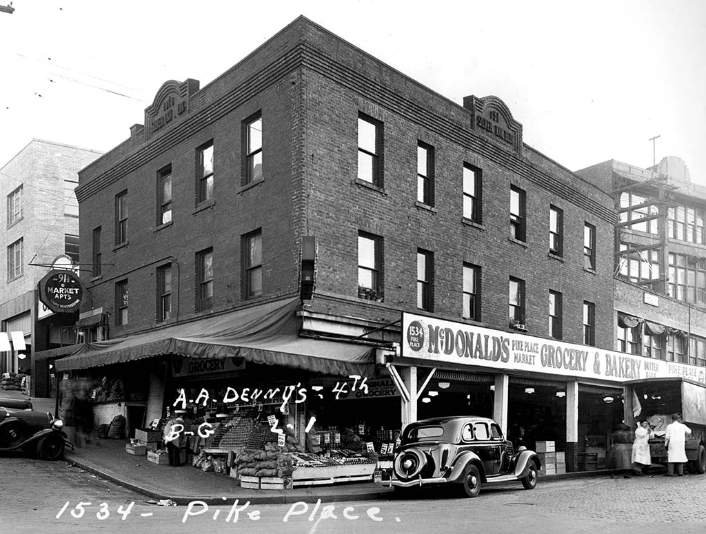 We stop to rest here just in front of City Fish. The Market was created to help keep food costs down but by World War I the city was seeing a high degree of war profiteering. At one point, the price of salmon rose to 25 cents per pound. As salmon began to skyrocket, the city partnered up with the State Fisheries Commission to sell the carcasses of salmon that had been killed for their eggs and sperm. Seattle established a municipally owned “City Fish Market,” which lowered the price of salmon significantly. Within weeks of the opening of City Fish, salmon dropped to 7 cents a pound. After the war, the City of Seattle relinquished its role as fishmonger. David Levy, one of the first in a wave of Sephardic Jewish immigrants, bought the stand and quickly gained a reputation as “Good Weight Dave.”
