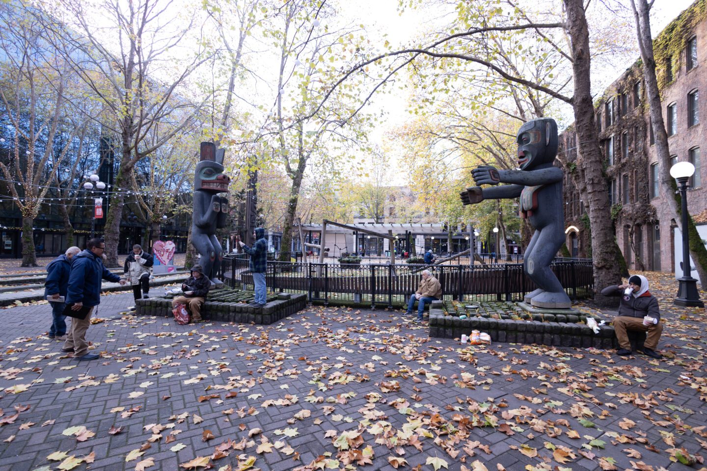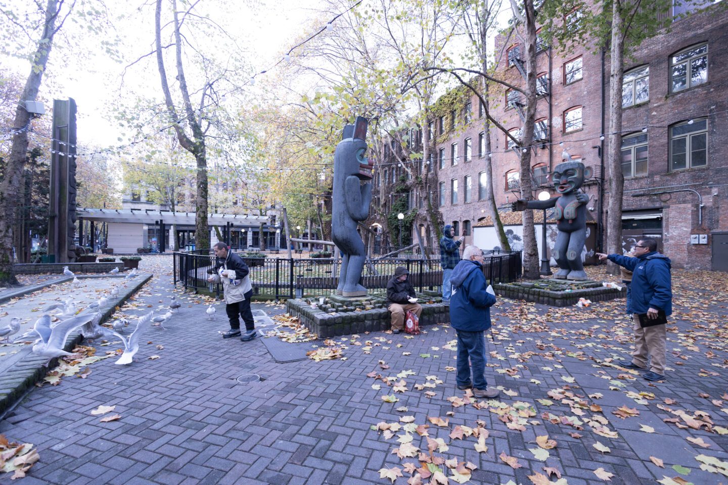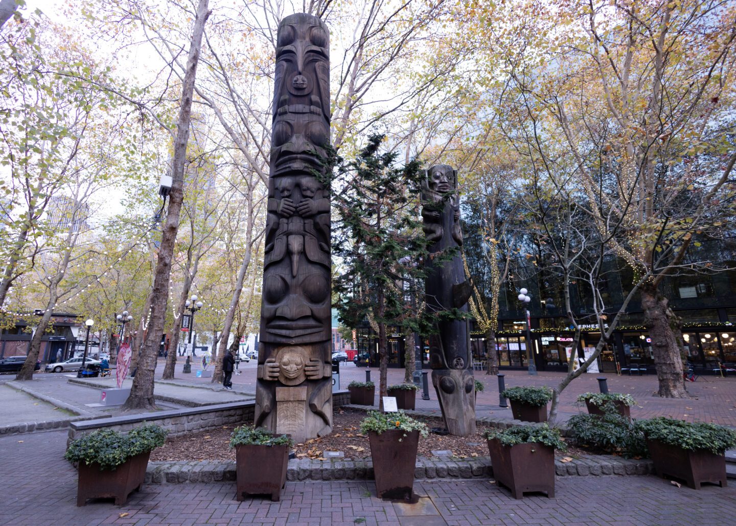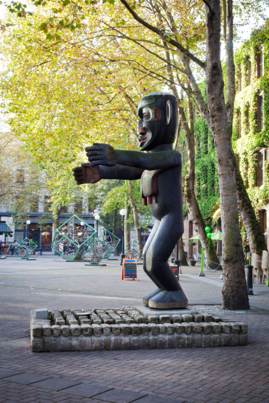 In 1985, developer, gallery owner, and long-time resident of Pioneer Square Richard White (d. 2002) donated, via the Pioneer Square Association, four carved totem poles by the non-Native artist Duane Pasco (b. 1932), to the City of Seattle. Pasco created the intricately carved poles between 1971 and 1973, with one work — Sun and Raven — bound for exhibition at Expo ’74 in Spokane, another world’s fair held in Washington. He honed his trade while living in Alaska, Washington, and British Columbia. These poles originally stood at White’s Kiana Lodge, a meeting center on the Kitsap Peninsula, along with several other totem poles by Pasco. When White sold the lodge, he donated the works to the Pioneer Square Association. Pasco took them to his studio in Poulsbo to refurbish them before permanently installing them here in 1987 and 1988. Pasco’s work has been called, “some of the city’s finest examples of carving in the Northwest Coast Indian style.” What Pasco may have lacked in ancestral heritage, he made up for in skill honed through a lifetime of immersion with indigenous artists and cultures whose style he strove to emulate.