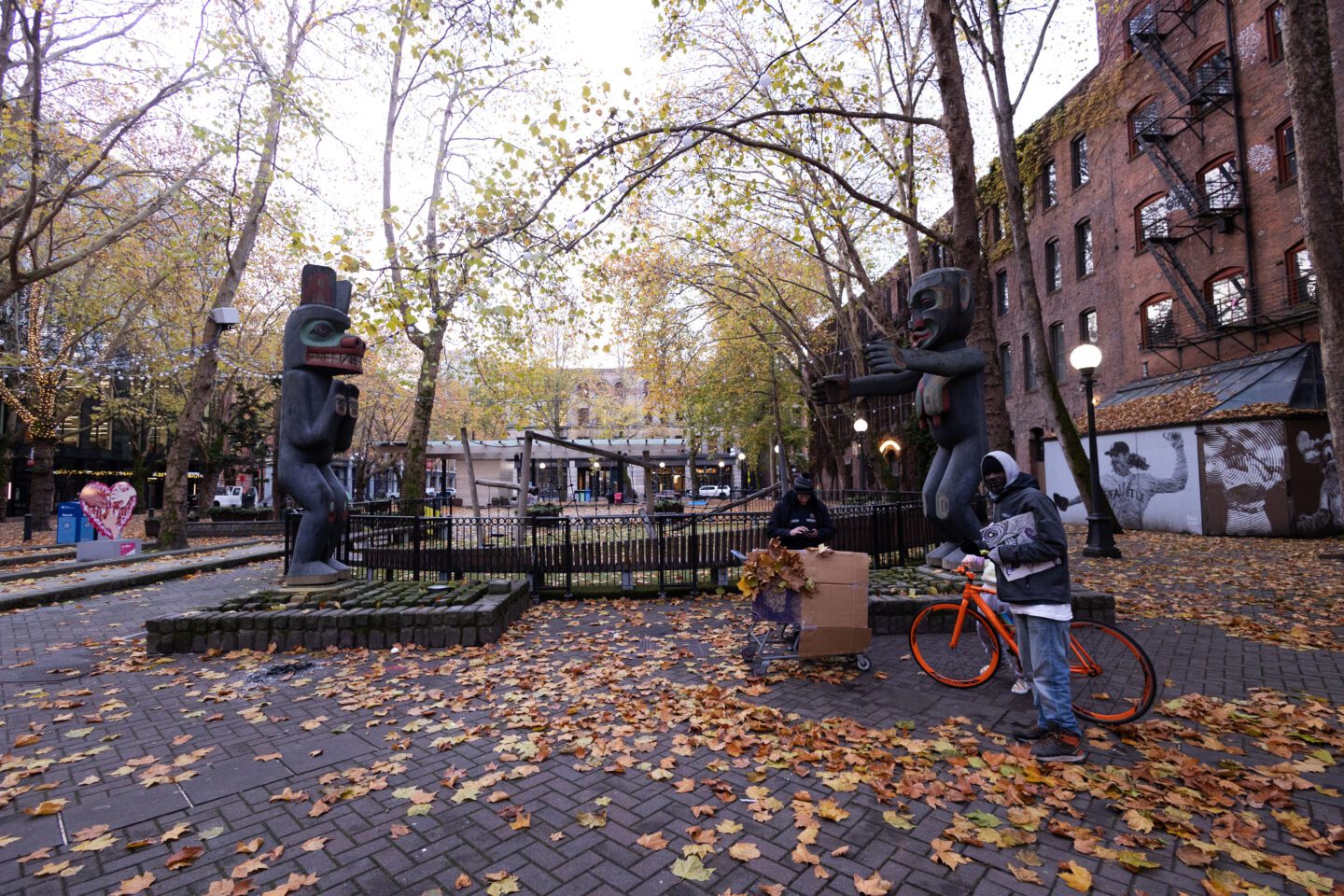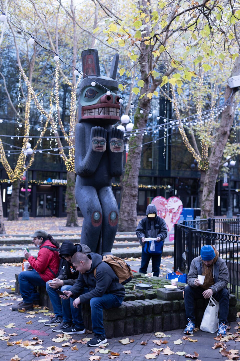 According to Pasco, the design references the indigenous legend of Raven bringing light into the world. It’s a story similar to that of the Tlingit Seattle Totem Pole seen earlier in Pioneer Place Park. At the pole’s base is the sun being held above the box in which it had been stored before Raven stole it. The story culminates at the top with Raven spreading sunlight to the world.