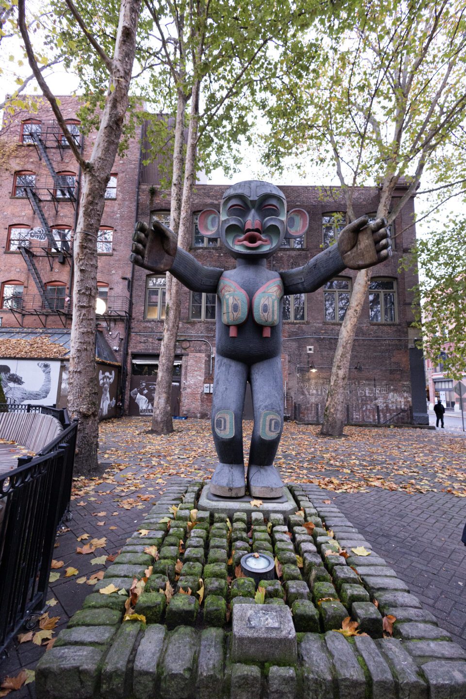 Unlike the first totem pole encountered on this tour, Seattle Totem Pole, the stories associated with these totem poles wouldn’t have come from Pasco’s own ancestors. Pasco may have derived the characters from those found in Haida, Tlingit, Kwakwaka’wakw (Kwakiutl), Tsimshian, Nuxalk (Bella Coola), Nuu-chah-nulth (Nootka), or other Northwest Coast indigenous cultures who carved works into cedar wood. The style and expertise of carving are what make these works special.