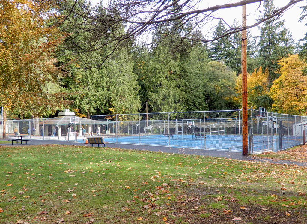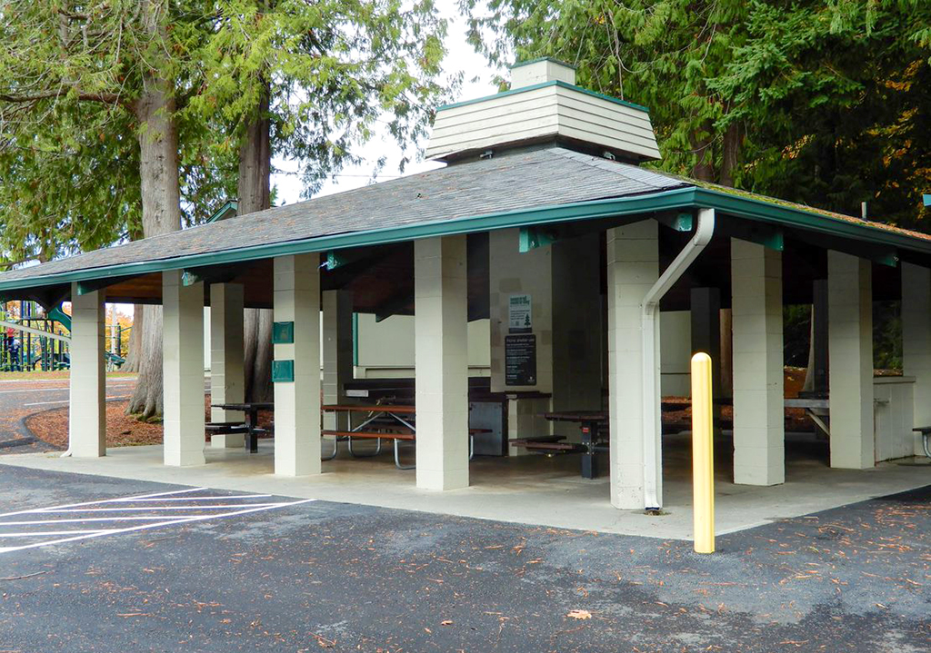 The picnic shelter is another structure built by the Everett Junior College Vocational Carpentry class, this one completed in the 1960s. Here you will find tennis courts and horseshoe pits. Note a trail entrance east of the shelter.