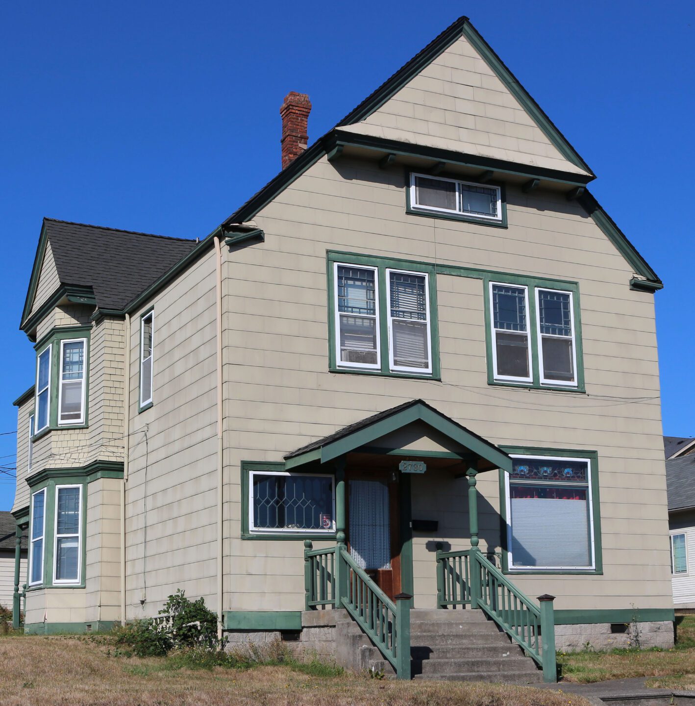 2730 Pine – William G. and Effie J. Swalwell House (1892): Architect Frederick Sexton. William Swalwell was the eldest brother, and a major real estate operator in the early Riverside neighborhood. The Swalwells had scooped Henry Hewitt, who was in New York City promoting his idea of an industrial city. Hewitt had intended to buy up as much land in the area as possible. The Swalwells created the first plat in Everett in September, 1891, called “Swalwell’s First Addition to the City of Everett”, and in November of 1891 “Swalwell’s Second Addition”. The house with its veranda porch cost $2500. The porch has not survived.