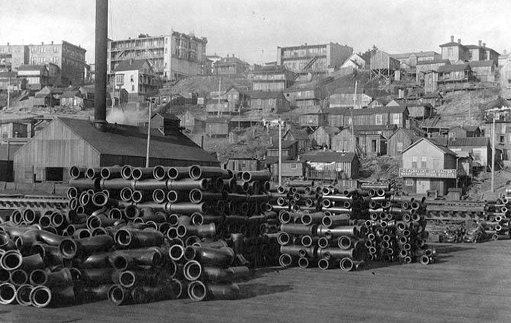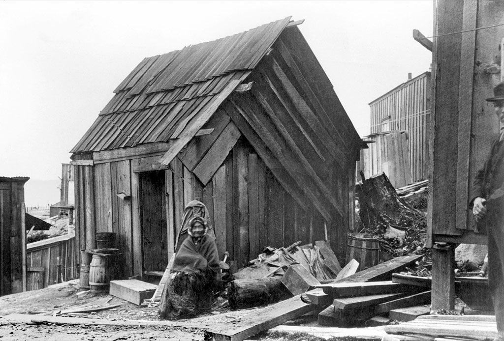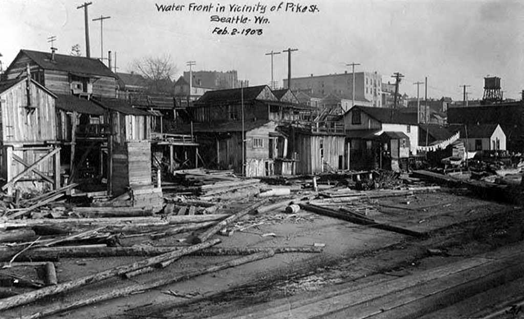 As shipping and industry grew along the shoreline in the 1890s, it remained home to a small community on the slope below what would become Belltown. Maps of the waterfront from the 1890s show a small enclave of houses north of Pike Street along what was then called Water Street. These homes were modest cabins perched on the hillside. In an era of haphazard development, people who were marginalized, including Indigenous people and those at the bottom rungs economically, often found places to “tuck in” to the city, including here on the hillside or on the south end of town where shacks filled in the edges of the tideflats, either on pilings or on floats.
