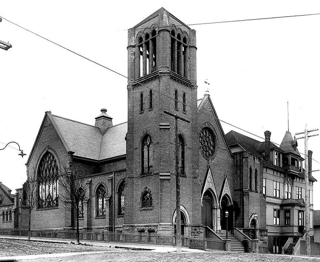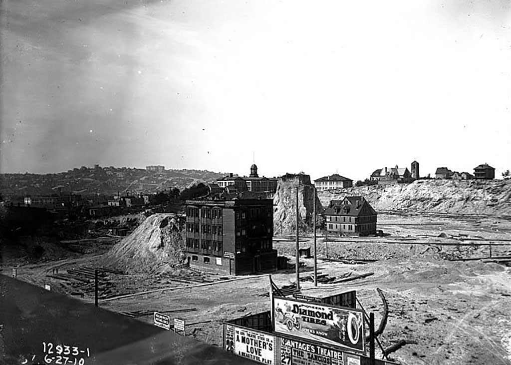 The church was the second of the two, landmark Denny Hill structures to be destroyed during the fifth and final regrade. The other was the great Denny School, which stood between 5th and 6th avenues at Wall Street. It had also been affected by the fourth regrade when the school’s west wing was lopped off: the regrade boundary had run through the structure and progress apparently trumped education.