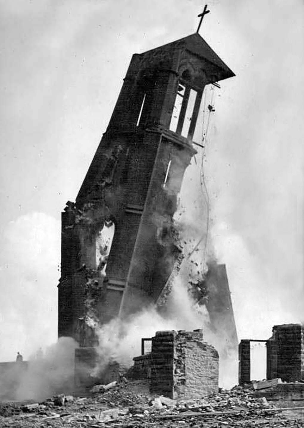 Four months later, Bishop Edward J. O’Dea laid the cornerstone for a new church, which opened in July 1900. That brick structure survived until March 29, 1929, ironically Good Friday. On that day, A.E. Swadener of the Vulcan Powder Company placed 20 sticks of dynamite under the building’s last remaining element, the church’s 100-foot steeple. When the dust settled, the tower still stood. Two more attempts led to two more failures. Finally on the fourth attempt, the tower collapsed. Those in attendance saw the tower’s resistance as “the intervention of a divine rejoiner [sic] against man’s reducing process.”