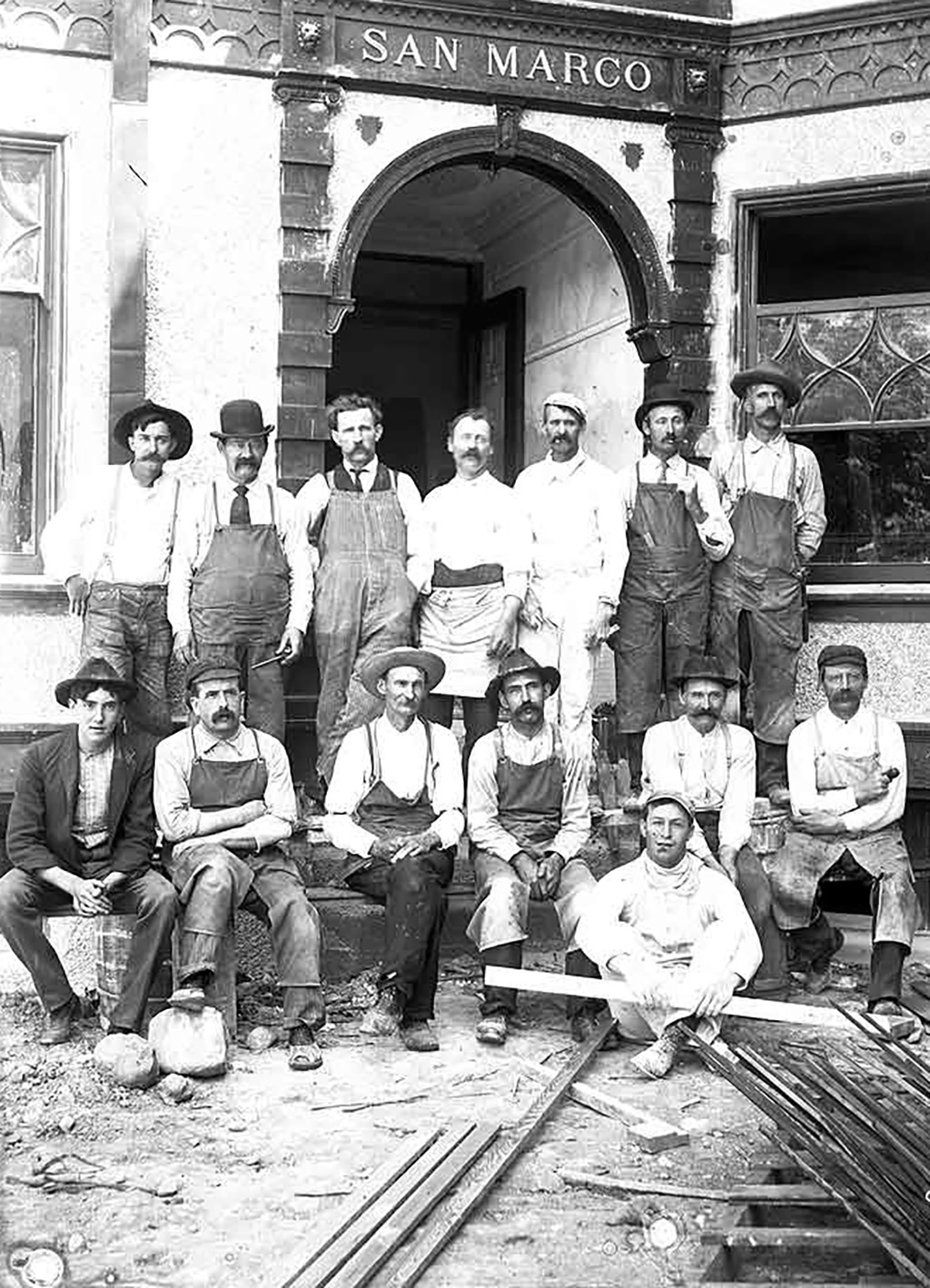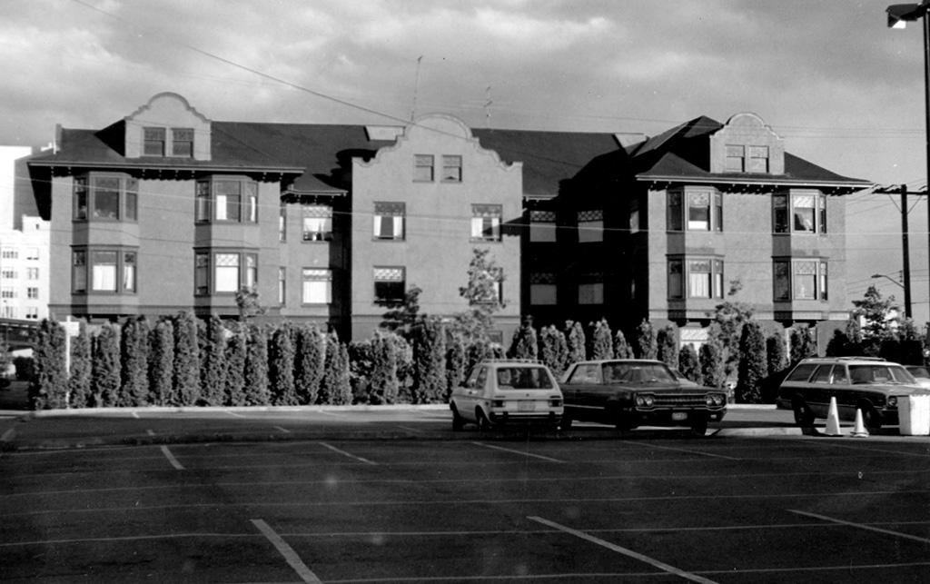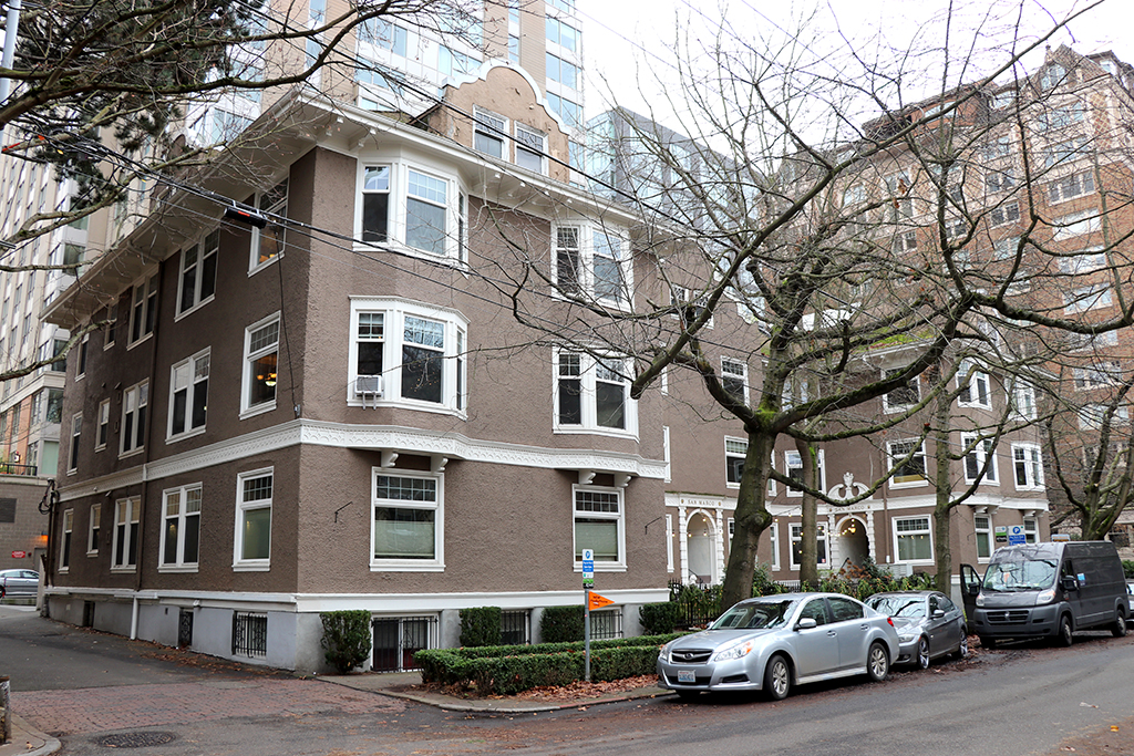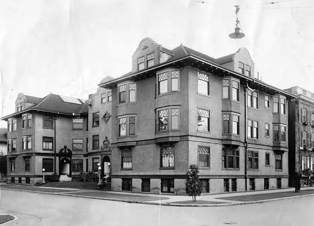 Continue one block east along Spring Street and note the mature urban tree canopy of the neighborhood. Looking east up Spring, one gets a sense of how apartments constructed through the decades have come to characterize the First Hill neighborhood. From the first apartment block built in Seattle in 1901 to the new towers piercing through the tree canopy, First Hill’s diverse collection of multifamily housing contribute to the densest neighborhood in the Northwest. On the southeast corner at Minor Avenue is the San Marco apartments. This lovely and evocative courtyard apartment, built ca. 1900, is a very early multi-family building constructed in what was until then an exclusive single-family enclave. A 1910 census confirms that the San Marco was a family-oriented building, with six couples having one child residing with them. Within the small entry courtyard, three arched entrances lead into the central section and each of the two wings, comprising a total of nineteen units. Designed by Saunders and Lawton, the gabled dormer above the central doorway, with its curvilinear parapet, is typical of the Spanish Mission style. A diamond patterned string course marks the transition between first and second floors and provides market contrast to the rough stucco siding. The restrained scale and massing of the San Marco allowed it to fit seamlessly into the residential streetscape.
