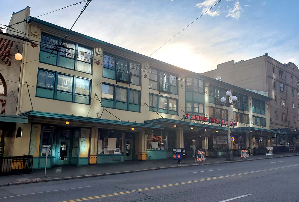 On December 15, 1941, the Sanitary Market was heavily damaged by fire. In 1942 it was partially rehabilitated to include a parking lot accessible from 1st Avenue on its top floor. As part of its renovation in 1981 the parking lot was removed, two stories were added at the 1st Avenue elevation, and one floor with recessed balconies was added at the Pike Place elevation. A central interior court and lightwell also were added.