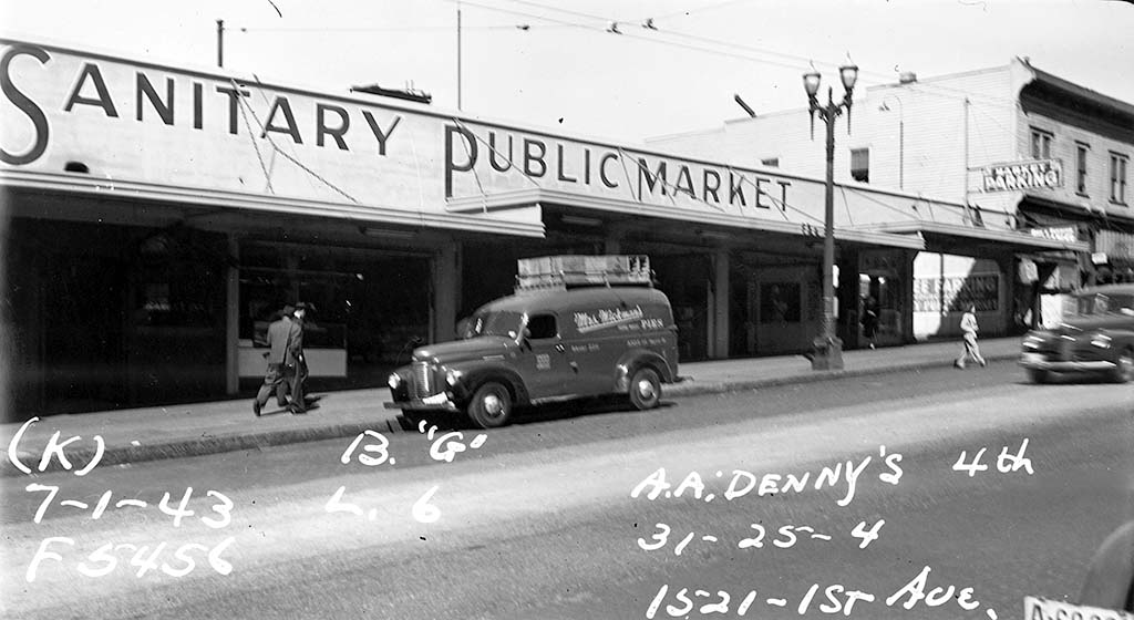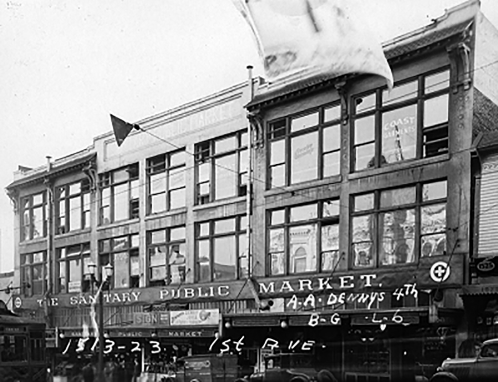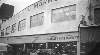 The completion of the Sanitary Market helped reinforce that the young Pike Place Market was here to stay, and within months of its construction, a number of workingman’s hotels were constructed to the northwest. By 1917, more than 60 businesses were established in the Sanitary Market, including four retail bakeries, seven creameries, three candy manufacturers, four fish stands, 12 produce stands, eight meat markets, and five delicatessens. In the 1920s a handful of textile manufacturers moved into the upper level, and the Three Girls Bakery relocated from the Corner Market to its present spot.