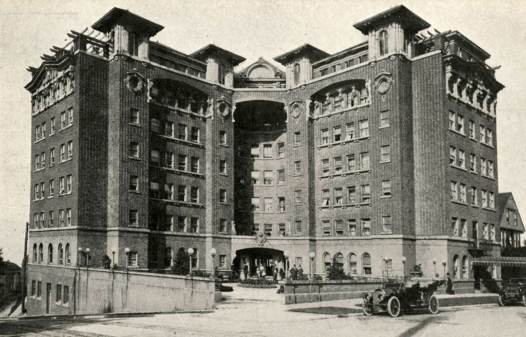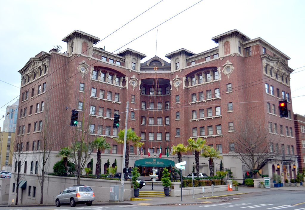 From the corner of Terry and Madison, you will see the Sorrento, situated dramatically above downtown. Samuel Rosenberg, a Seattle clothing merchant, developed the hotel in preparation for the crowds expected to arrive in the city for the Alaska-Yukon-Pacific Exposition. He hired architect Harlan Thomas to design it in 1907-1908. Thomas had made several trips to Italy, and convinced Rosenberg that Seattle’s topography and the view of the harbor recalled the Naples coast. Therefore, the new hotel would be Italian Renaissance in design and be named “Sorrento,” complete with palm trees adorning its entry court. So that all guests could appreciate the full sweep of the view, Thomas put the dining room on the top floor—a first for a hotel in the city. The patterned brick and terra cotta building opened for business in the spring of 1909.