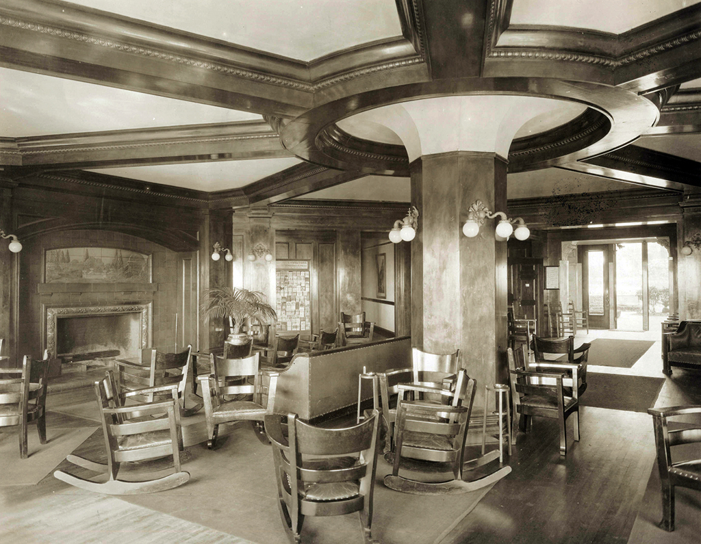 During its years as a residential and tourist hotel, the Sorrento catered to numerous important guests, especially concert artists and stage stars appearing at the Moore and Metropolitan theaters. Honduras mahogany paneling adds warmth to the lobby. The Italian garden panel above the fireplace surround was commissioned from the Rookwood Tile Company in Cincinnati. The lobby was originally furnished with Mission oak chairs, rockers, and tables, and was much more spartan than you see it today. The Sorrento Hotel is a Seattle Landmark and listed in the National Register of Historic Places.