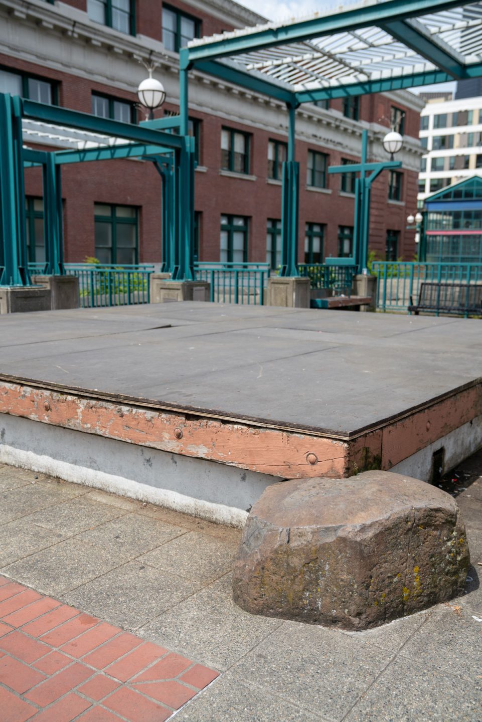 The 17-foot-square stage at your feet was designed for seating and performances. Made of heavy timber supported by two large basalt boulders, designer Alice Adams styled the platform after the floors and foundations of Japanese houses.