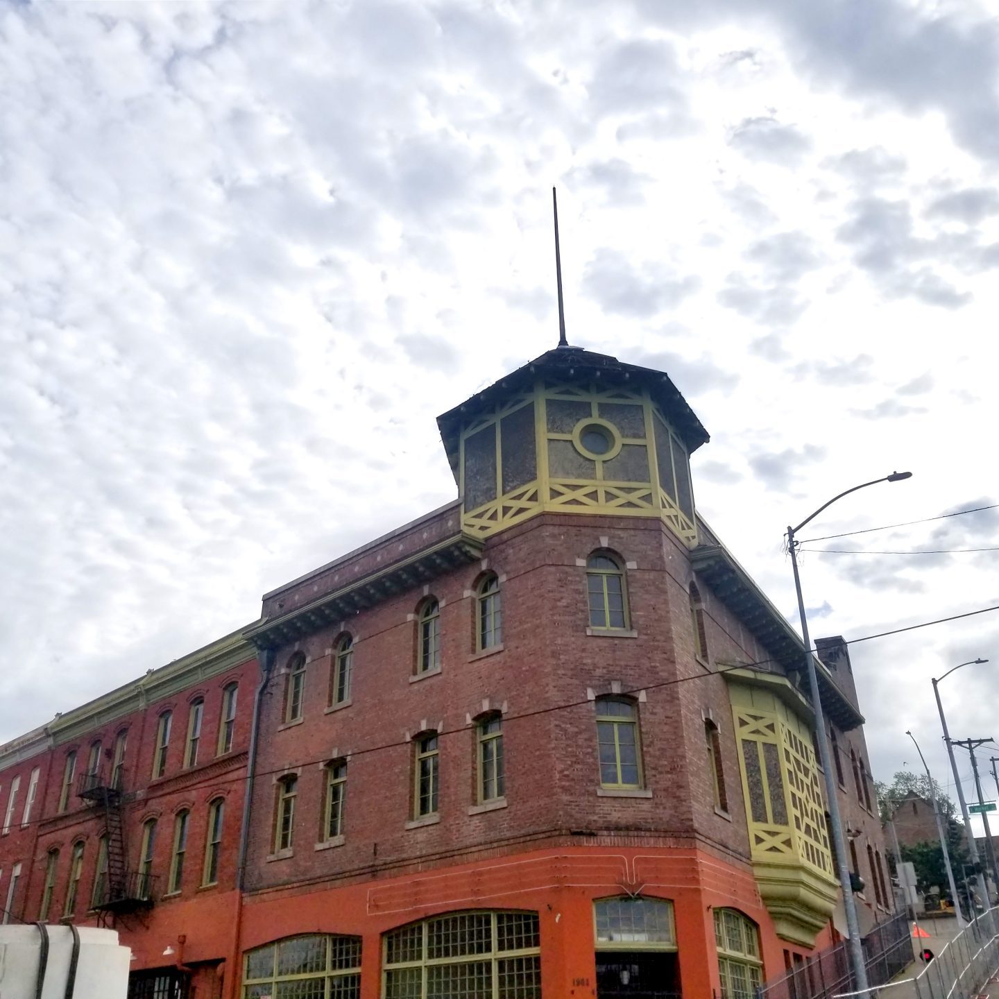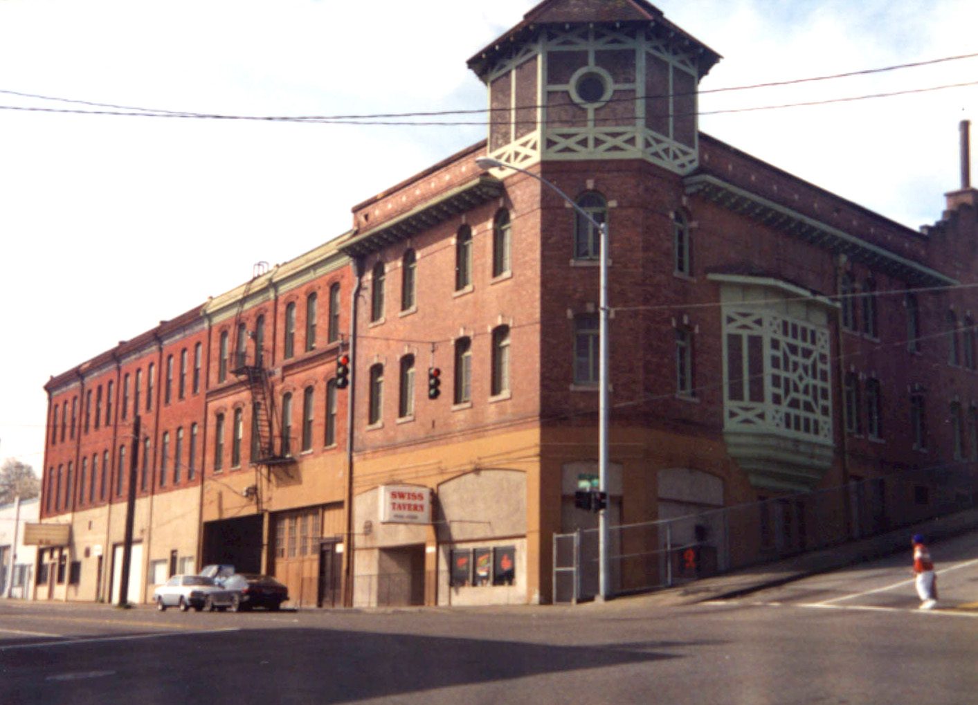 The Swiss Society finished this chalet-influenced hall in 1913 on neutral ground between the jobbers district and the ethnic neighborhoods above Market Street. The main interior space is a charming folk-art decorated hall with scrolled waif panels, a stage and proscenium scaled perfectly to the size of a polka band, and a listening balcony above the dancing floor. The hall’s distinctive tower and mock half-timbering once marked the southern edge of Tacoma’s market district. Japanese grocers and merchants lined Market Street to the north. Scandinavian, Italian, German, and Southern European immigrants settled in the wood-frame houses up the hill. Warehousemen, wagon drivers, and shipping clerks all earned their wages just below. To the south, there were several of the Northwest’s best breweries, and at the middle of the mix sat Swiss Hall.