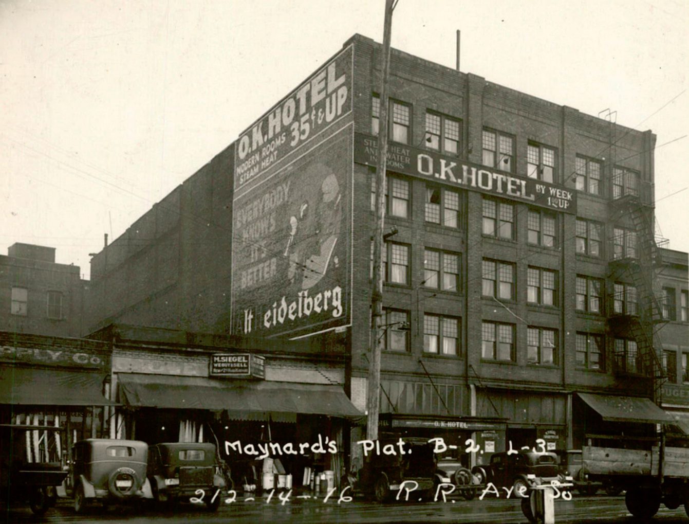 The O.K. Hotel was built in 1914 here on Railroad Avenue S (today’s Alaskan Way S) in a sketchy part of the neighborhood. Facing west toward the rough-and-tumble Elliott Bay waterfront, it was geared to salty sailors, muscle-bound dockworkers, and lubricated lumberjacks all raring to blow their dough on Skid Road.