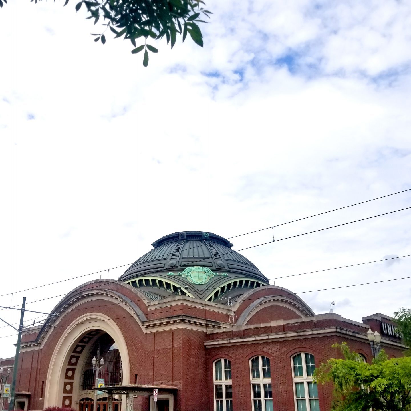 The building’s signature copper dome is a particularly rich embellishment atop the strict symmetry of the classical building. In the correct stylistic manner, Union Station exhibits the fundamental design ideas of a neoclassical structure or column — a strong base (in concrete), a central block (or more than a million bricks), and an ornate capital or cornice (in this case the vaults and dome). The central body of the building is flanked by two symmetrical wings, which widen the façade along Pacific Avenue and help disguise the classical column influence.