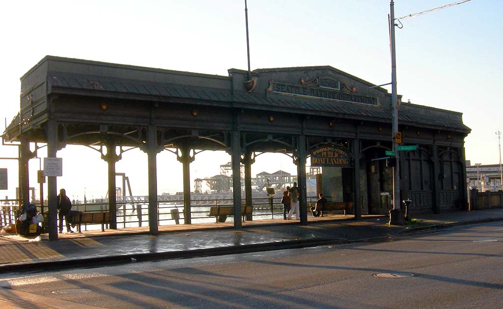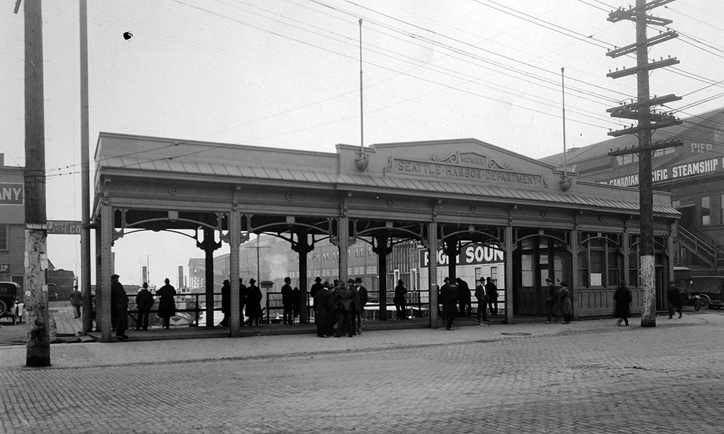 The Washington Street Boat Landing was built as the Naval Shore Station and opened for use on July 3, 1920. Built for use by small craft that carried sailors to shore from larger ships anchored in Elliott Bay and from the Sand Point Naval Station on Lake Washington, the station also acted as moorage and an office for the city’s harbor patrol. On the south side of the station’s long slip, enlisted men’s barges used one float, and on the north side, officer’s barges tied up to another float. More than 80 feet of additional space was provided for other vessels, including the harbor patrol. Gracing the station was an 86-foot-wide wrought-iron pergola designed by City Architect Daniel R. Huntington (1871-1962).