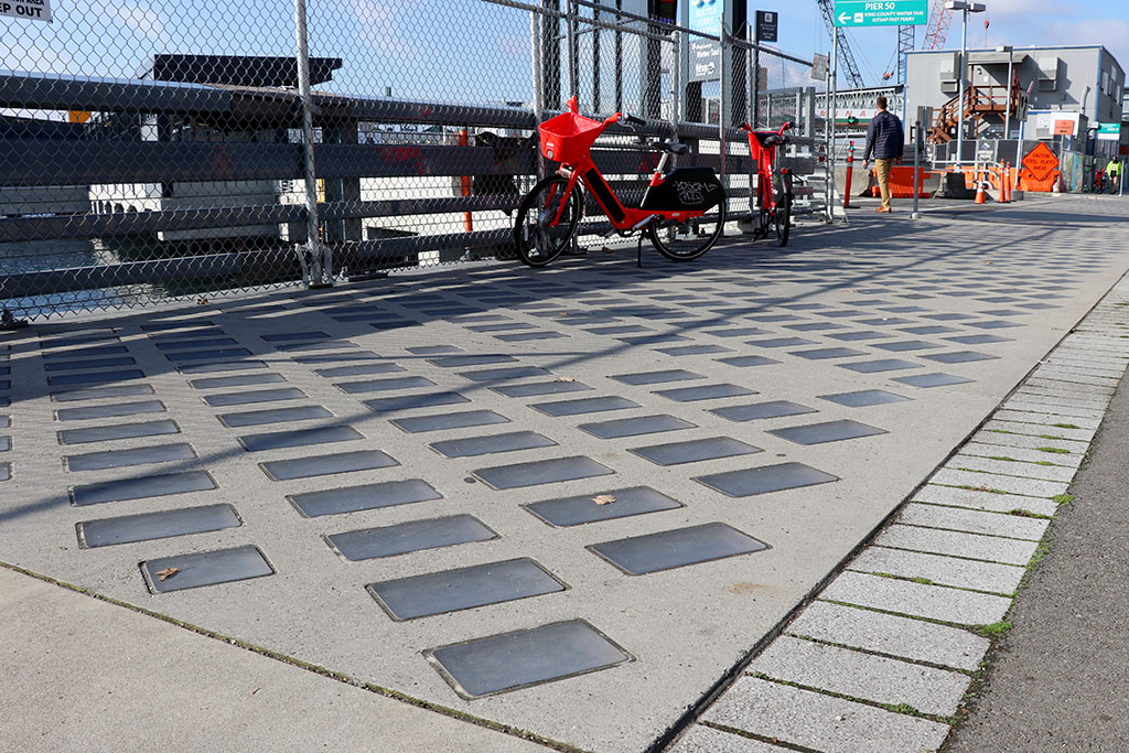 Glass blocks in the sidewalk along Alaskan Way provide light to the water along the shelf, which attracts fish that might otherwise follow the outer edges of the piers to avoid the dark under-pier areas. Keeping closer to the wall and in shallower water helps protect the fish from predators. The “fish highway” along the wall serves as a partial proxy for the former estuary and increases survival rates of salmon migrating through Elliott Bay to and from the Duwamish River.