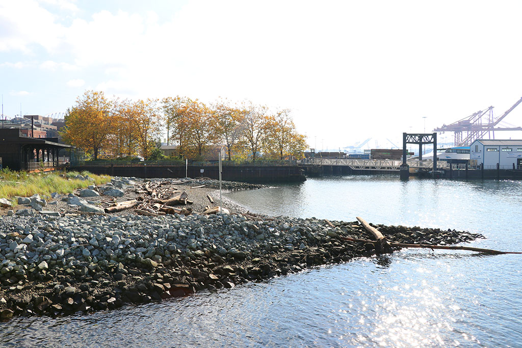 The new habitat beach on the west side of the landing was completed in December 2019. It was built as a transition zone between deep water in the bay and the habitat shelf, a ledge of concrete extending out from the seawall’s face, constructed as part of the new seawall extending north to Broad Street. A study by the University of Washington’s School of Aquatic and Fishery Science informed the design of the habitat shelf. It found that a horizontal surface molded into cobbled shape encouraged mussel and algae growth. Other flora and fauna will grow on the shelves, but the study focused on mussels and algae because they are key elements in attracting small invertebrates, which, in turn, provide food for juvenile salmon and other fish.