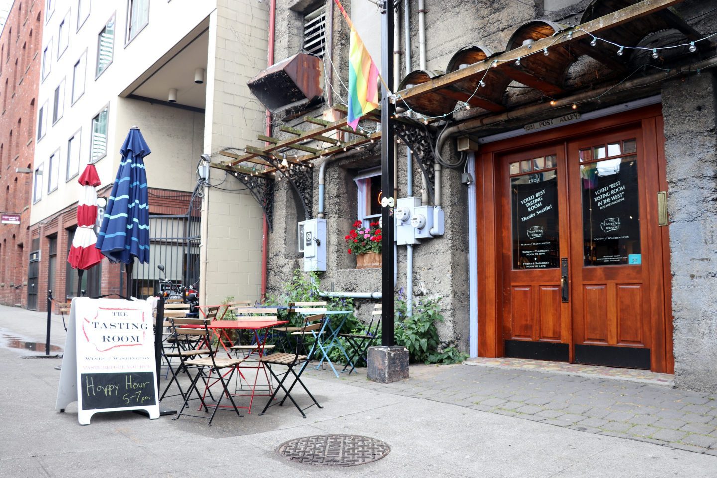 This Smith Building dates to 1906, with its main façade and entrance on First Avenue. Its early years saw a variety of businesses and organizations using the main and upstairs floors, a more memorable tenant being the adult-film Midtown Theater. As noted at the previous stop, the Post Alley side of this block was long a working alley and only in the past few decades became a destination for eating and shopping. Prior to becoming The Tasting Room, this space was an antique shop.