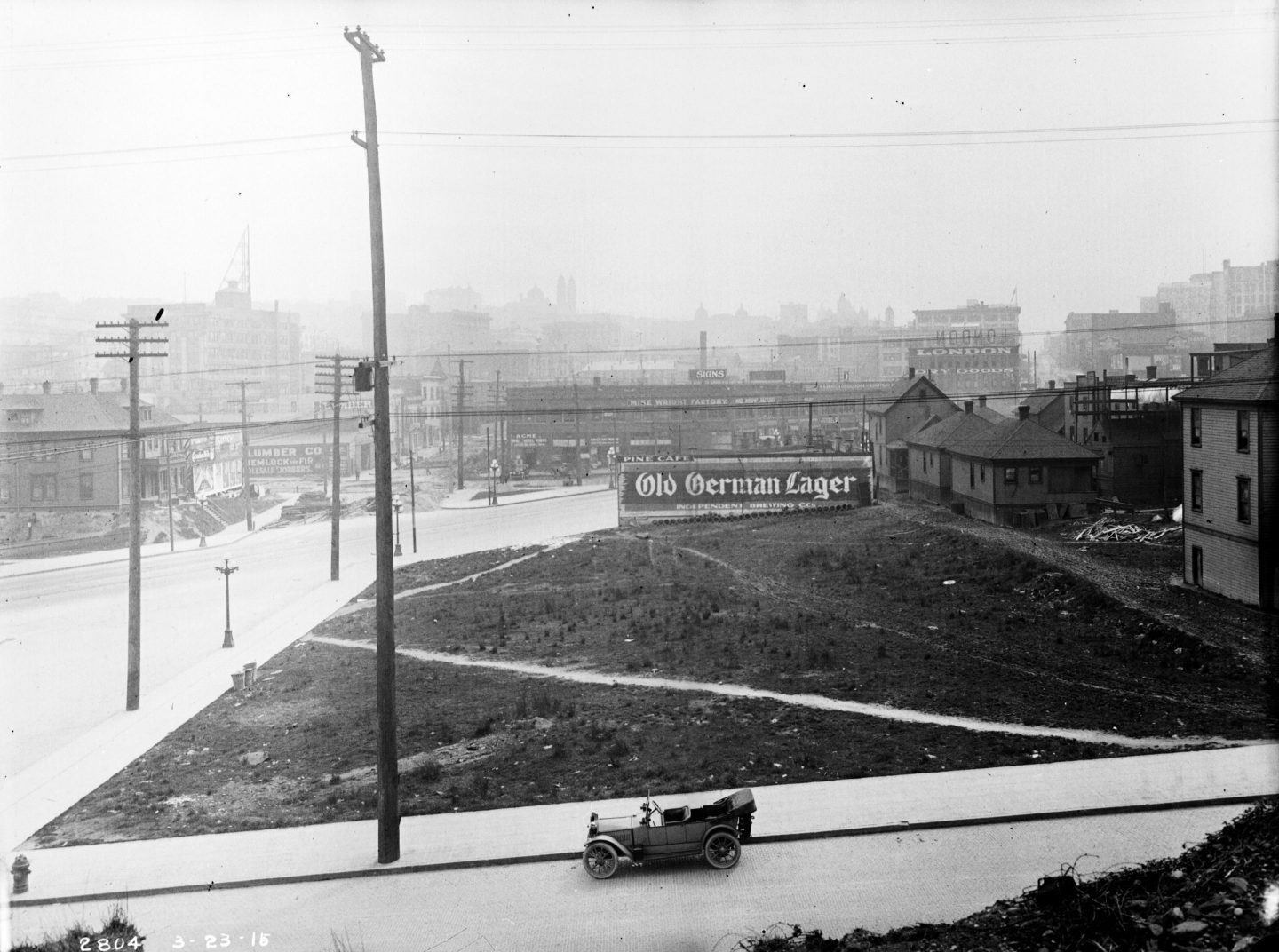 Griffith’s line eventually extended over a planked trestle along Lake Union’s western shore through Fremont to Ballard. It was joined in 1891 by David Denny’s streetcar, which ran on the east side of the lake. In 1905, the city started work on a new link north from downtown. It would be a diagonal road running from Fourth Avenue and Pike Street to the former Rollin Street, which had been renamed Westlake Avenue in 1895. Using fill from a variety of locations, the city connected the old and new Westlakes by 1908.