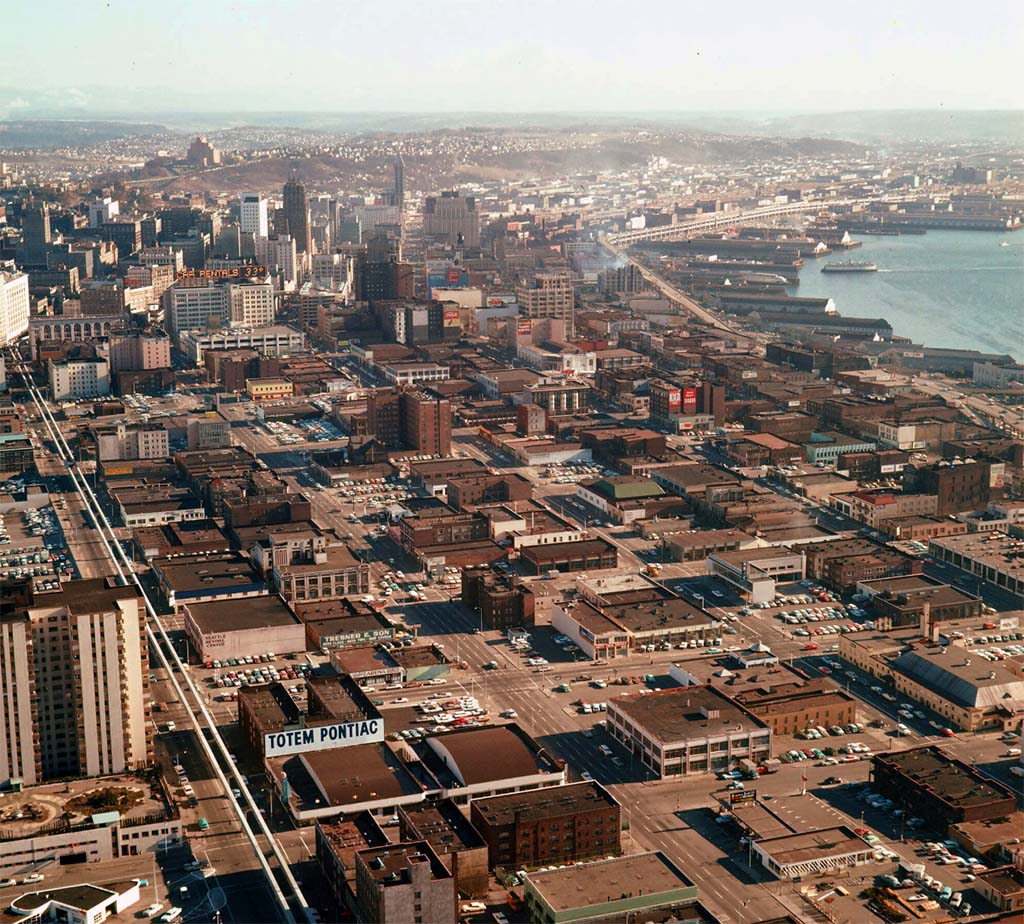For years Bell’s Town — stretching north from Stewart Street to Denny Way, and from the waterfront cliffs east to about 3rd Avenue (where it abutted the very steep Denny Hill) — remained a sleepier area than the nearby central business district. The “Denny Regrade” project in the early 1900s transformed Bell’s Town, and the neighborhood was more commonly known as the Regrade. In time Belltown grew to include hotels, apartments, theaters, ballrooms, taverns, union houses, and light industry, and for a spell was the home of Film Row, Seattle’s movie industry. By the dawn of the twenty-first century, wrote HistoryLink founder Walt Crowley, the bustling Belltown neighborhood was offering “a yeasty combination of the bohemian and the trendy, with a significant nightlife.”